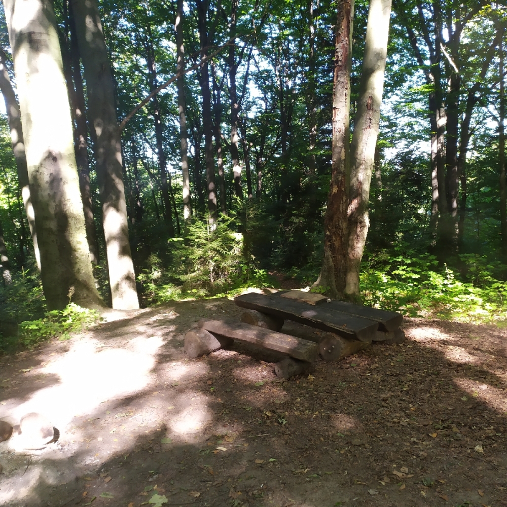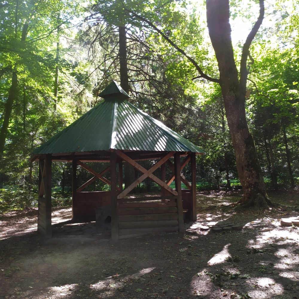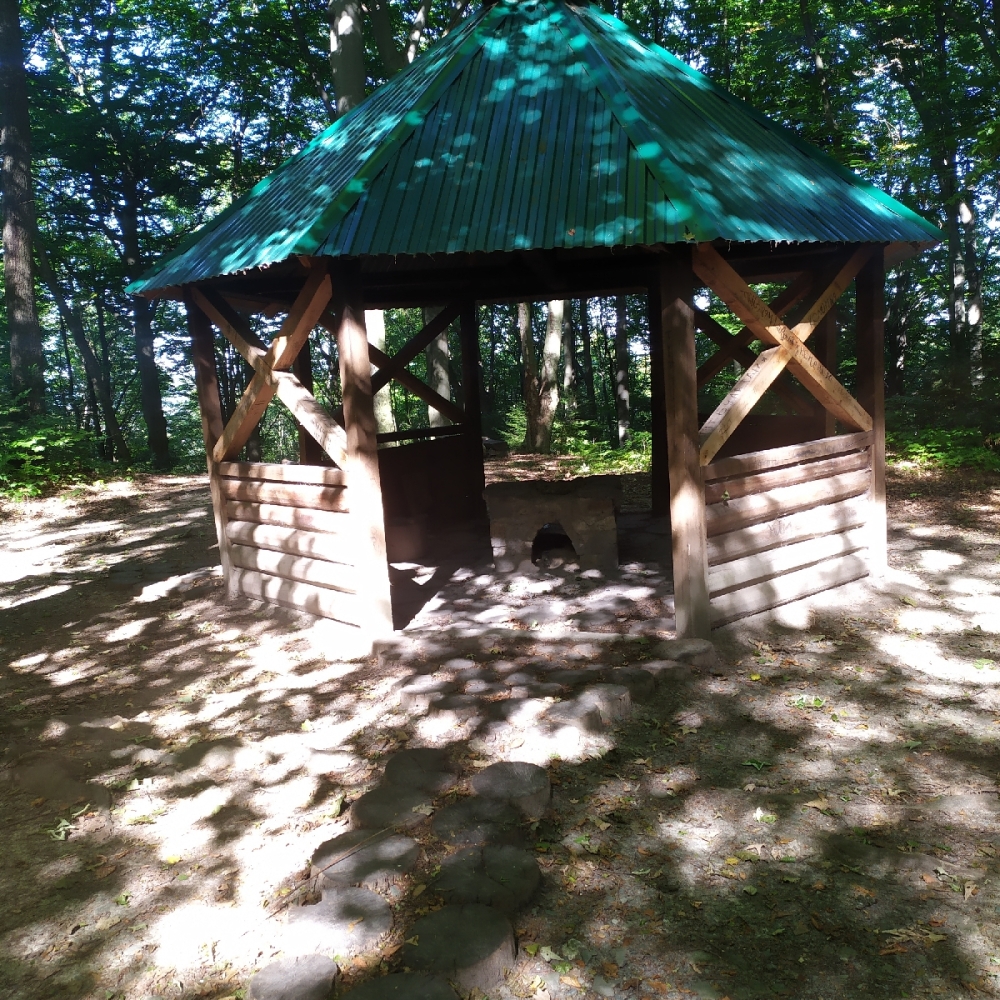 Є камяний мангал, столики із лавками