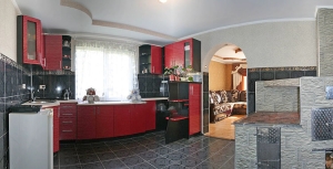 Двоповерховий будинок на 5 номерів (15 місць). На першому поверсі — кухня (кухонне вогнище, електрична плита, холодильник, електрочайник, посуд, мийка);