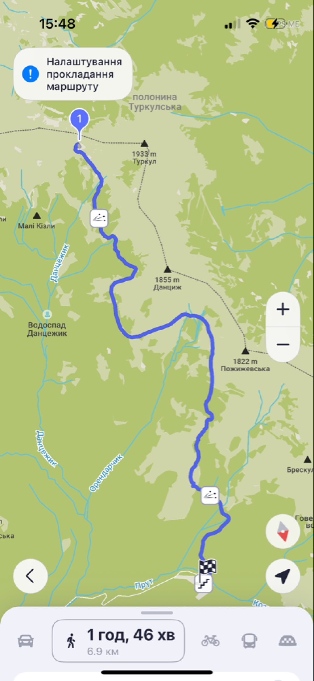 В додатку фото маршруту, який прокладає maps.me і не раджу нікому ним йти. Якщо все ж таки вам як і мені зручно користуватись саме цим додатком для навігації, тоді прокладайте маршрут із оз. Несамовите до бази Заросляк з проміжною точкою водоспад Данцежик, тоді вам прокладе нормальний, промаркований маршрут.