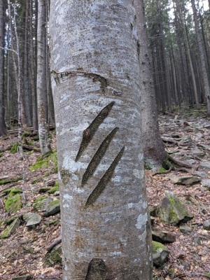 Дуже цікавить від чого сліди, можливо хтось добре розбирається або сам зустрічав. Під полониною Хом'яків, біля дороги, по маршруту який йде від Женецького водоспаду. Щоправда слід був лише один в радіусі 15 метрів, де був сніг (можливо дуже давній). Стосовно сліду на дереві, то більше подібне на порізи ножем, а ось на снігу наче передня лапа ведмедя. Фото зроблене 3 травня 2021.