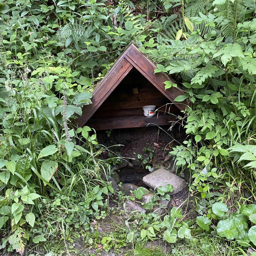 В бік Синячки після підйому по каменях - різкий поворот праворуч, а прямо - облаштоване джерело з водою